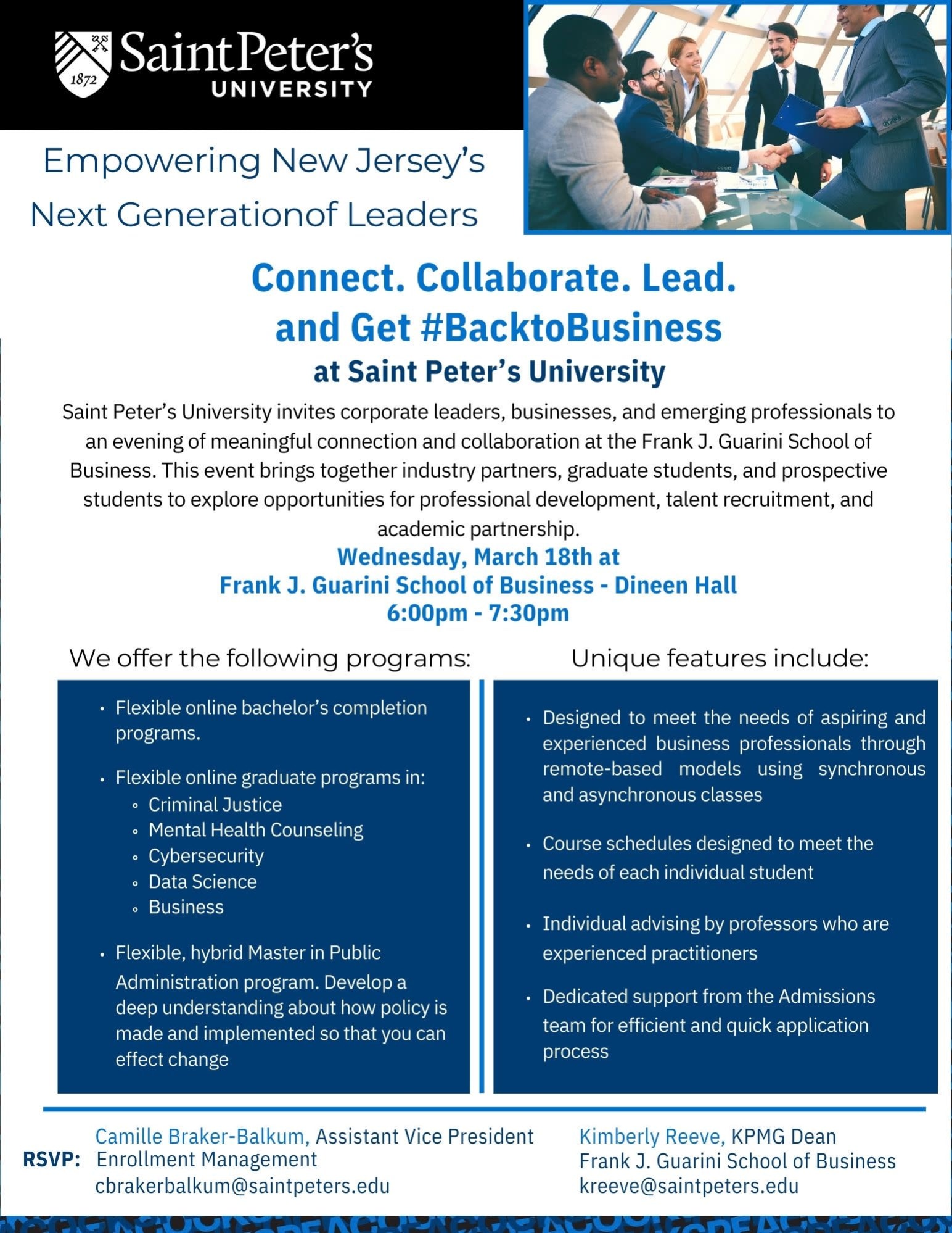 Reconnect with the business community, expand your network, and discover new opportunities at the Frank J. Guarini School of Business as Saint Peter’s University brings together corporate leaders, professionals, and students for an evening of meaningful conversation and collaboration. Join us for #BacktoBusiness and be part of the conversation shaping the next generation of talent and leadership in New Jersey.