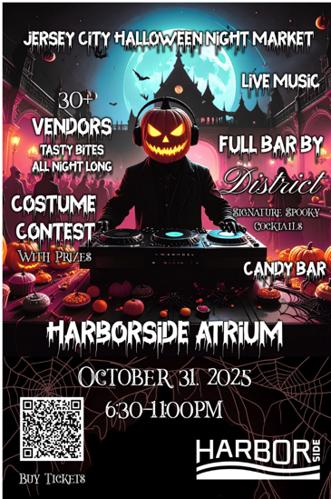 Jersey City Halloween Night Market Halloween is Coming to Harborside! Try Over 30 vendors from exotic cuisine to local artisan and more. All while enjoying cocktails from The District Bar, Live DJ interactive games and a costume contest. Buy early and save prices go up at the Door.